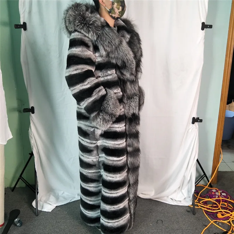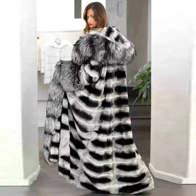 Special Offer 140cm Lange Frauen Echt Chinchilla Rex Kaninchen Pelz Mantel Große Kapuze Ganze Haut Dicke Warme Echte Kaninchen Jacke Mit Splitter Fuchs Kragen Discount 30% Today!