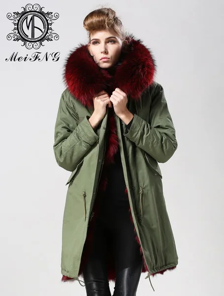 Special Offer Marke MeiFng Grün/schwarz/gelb/navy Winter Frauen Echtpelz Jacke Mit Big Echt Waschbären Pelz Haube Discount 0% Today!